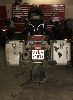 super concentré ou on est à terre...Après près de quatre heures , je retrouve le bitume... quel plaisir... Au devant de moi, je vois les éclairs... Je décide de changer ma route et j'évite l'orage en partant en direction du Chili.... Je fais 10 km et je croise un motard qui me fait des appels de phares, je m'arrête et je parle avec lui en espagnol pour découvrir que c'est un bon Suise de Berne qui voyage depuis 12 mois en moto...Il me dis que la route est bloquée... Donc on repars et on reprends la route prévue... L'orage a passé par contre la piste en terre était super glissante, encore une heure trente avant de retrouver un Eco Hotel (nouveau nom pour Auberge de Jeunesse)... C'était sympa de parler suisse allemand pour une fois...