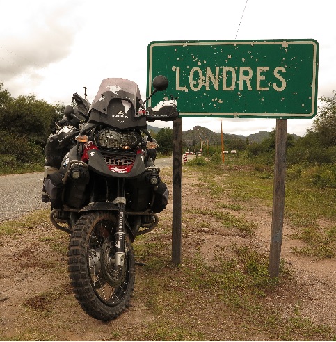 Ce 12 avril je pars de Guandancol, de nouveau de grands espaces, et je décide de me titer un max de kilomètres la route est belle mais pas trop interessante , à part la visite de Londres...God save the Queen...Ensuite je continue pour tracer un max... En fin de journée je décide de m'arreter dés qu'auberge se présente vu que l'orage menace...Enfin un hòtel de luxe dans la région de la Bodega ou je passe une soirée de Conquistador... Mon premier bain, que cela fait du bien...