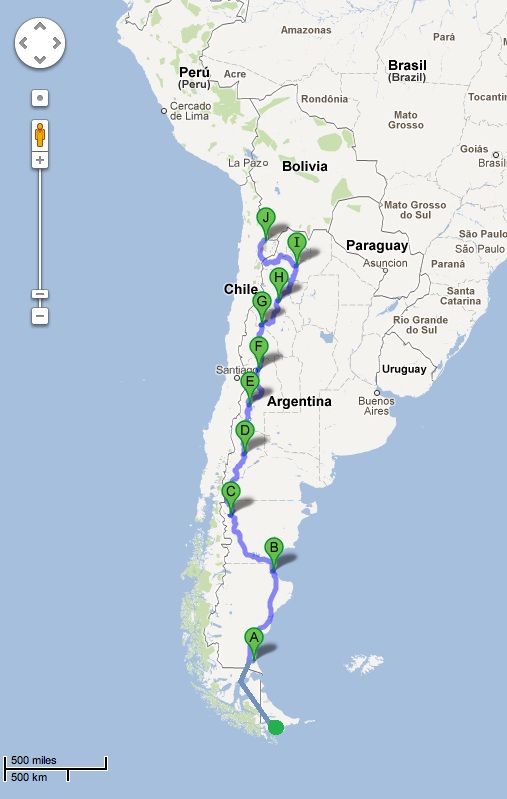 Punta Arenas...De mon côté je contrôle mon essence et je remarque que mon autonomie est de 170 km qui est largement suffisant pour atteindre Rio Gallegos qui se trouve qu'à 107 km...Je pars avec cette crainte que mon pneu ne tienne pas la distance. Je roule et voilà que les rafales de vent s'empire, je fais 70km et mon autonomie note 35 km, donc je n'arriverai pas à ma destination. Quel panique, par bonheur en sortant de cette valée, je me trouve sur un plateau avec enfin du vent arrière et cet ainsi que j'ai atteint la station avec 2 dl d'essence....Quel stress...