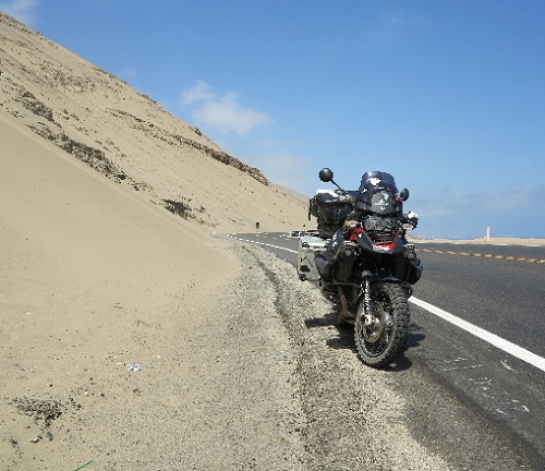 blogueurs de choisir la route journalière, pour cette raison je ne vais pas suivre son programme...Car cela me perturber dans ma montée effreinée... Il est possible que l'on se revoie à Quito sinon il viendra à Château-d'Oex ou j'irai le trouver en Espagne... Un type super sympa, cela m'a fait quelque chose de le quitter... Suerte Posada... qui veut dire en français...Bonne chance Posada. Et oui, je reprends la route et pas n'importe laquelle la Panamerican Sur (sud) et c'est juste incroyable c'est que du désert, il y a même des dunes, je roule quatre heures et c'est là que je vois l'Océan Pacifique...Cela fait du bien et je me rens compte que je suis encore bien loin de la Suisse. Je m'arrête au bord de l'Océan pour boire une petite bière avec le déferlement des vagues et une petite spécialité du coin appelé '' Ceviche '' qui est du poisson frais marinées avec du citron et du coriandre et des légumes doux, c'est le meilleur plat de tous mon voyage...Ca fait du bien... Ensuite je reprends la route pour atteindre Lima qui est une très très grande ville et ou la technique de conduite s'appelle Free-Ride...Pour les spécialistes du ski,ils compennent!... Grâce au GPS je trouve la pension Sevilla avec des gens très sympathique.... surtout la patronne Carmen qui voulais absolument une photo avec moi avant mon départ... petite avec du caractère m'a dis son mari...