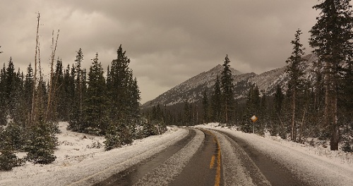 les lacs sont encore gelés, c'est l'hiver... Trois heures plus tard j'arrive à Jasper et je croise les rocheuses pour atteindre une route qui va me mener à Dawson Creek où je vais passer la nuit...J'ai eu un problème électronique sur la BMW dans une station d'essence, elle ne voulais plus démarrer, plus de contact, cela m'inquiète un peu...On verra demain si elle désire continuer la route...