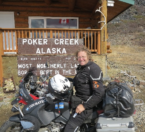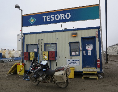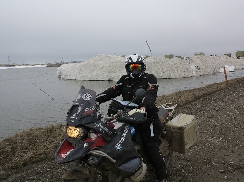 Le 6 juin, je quite Colfoot à 6.30 heures du matin, il fait pas trop froid 14 degrés, je roule et je surprends un lynx qui coupe la route devant ma roue, je fais 150 km et j'attaque le col qui a rendu fameux les convois de l'impossible qui passe à la télé...C'est impressionnant mais dans des conditions hivernales, cela doit être assez fou...Ensuite je prends des immenses vallées et je suis accompagné par le Pipeline qui suit la route qui mène à Deadhorse...Tout est magnifique jusqu'à 100 km du but ou le temps change complétement, c'est le brouillard qui est créé par les vents de l'Artique qui se mélange avec le climat de la vallée... Et c'est à midi, heure locale que j'arrive à Deadhorse avec des flocons, il fait zéro degré et je vois que des containers, des raffineries, du brouillard, une ville très triste, je cherche mon chemin pour trouver ma matière première, l'essence et c'est là que je trouve un container ou tu mets ta carte visa et tu fais le plein...En partant, j'arrête un pick up pour faire une petite photo pour immortaliser l'Artique et voilà que je décide de quitter ce trou au plus vite...Et c'est ainsi que je force pour passer les premiers150km pour retrouver une température normale et je retrouve ces vallées magnifiques pour rejoindre Coldfoot sans réaliser que je viens de terminer mon rêve...Sur mon chemin, je vois des carribous, un boeuf musqué, c'est vraiment sauvage l' Alaska. En arrivant à Coldfoot, je mange un super souper, deux bières, et j' insiste pour retrouver mon lit après cette journée pleine d'émotions...J'arrive pas encore à réaliser....
