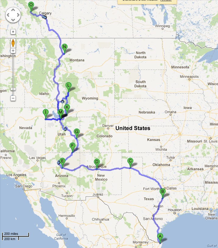 Pays et états traversés: Texas, New Mexico, Arizona, Wyoming, Utah, Montana, Idaho aux USA,